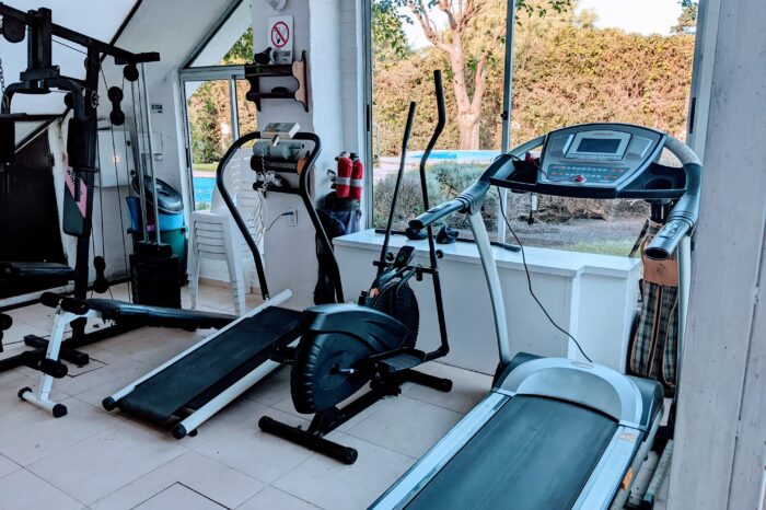Un gimnasio con vista al jardín y parking dentro del hotel.